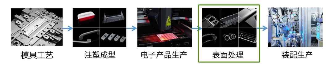 车灯底材(ABS BMC等)表面处理清洗→底漆的涂装→喷漆、移印、高光多色丝印、烫印、真空镀膜→成品包装。